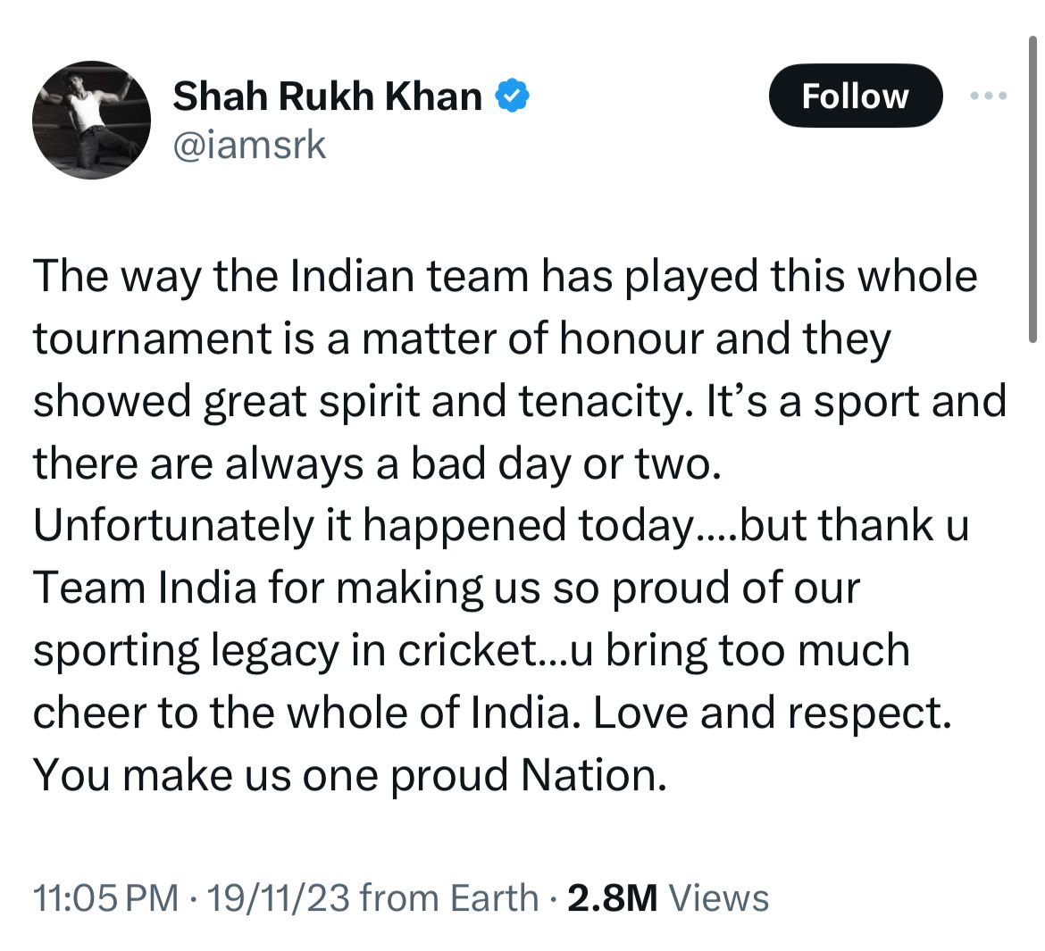 Amitabh Bachchan also posted on X, stating, "T 4836 - Team India .. last night’s result is not, in any way, a reflection of your talent, capability, and standing .. proud of you .. better things will happen .. keep at it." Continuing, he added, "T 4836 - .... your talent, capability, and standing are beyond all that .. it is supreme .. the results of the 10 you played exhibited that .. you are a feared team .. just see how many ex-Champions and Winners you devastated in this WC .. you are the BEST .. and shall remain so .. #TeamIndia #RohitSharma."